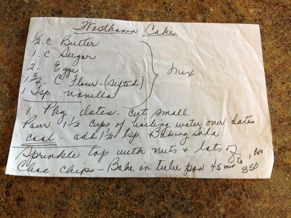 As I was rummaging through my hand written recipes this morning, an odd shaped piece of paper brought back memories of Aunt Nance. She was Jim’s Aunt, and a very special person. She would often bake this cake and bring it along to family gatherings. The chopped dates in the recipe are undetectable after baking but they are essential as they add great flavor and moisture to the cake.