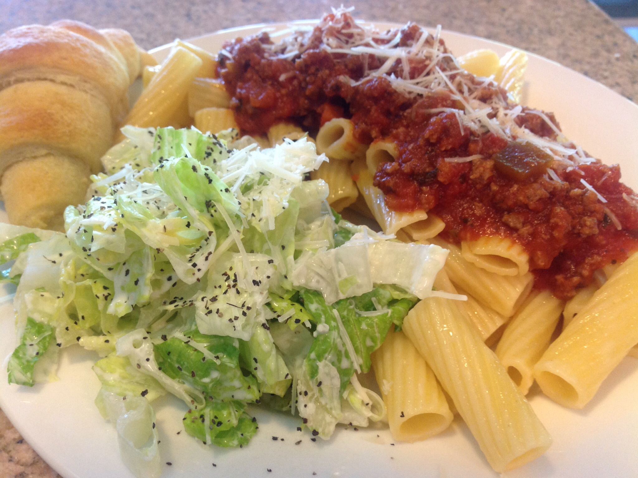 Spaghetti with meat sauce, crescent rolls and Caesar salad,