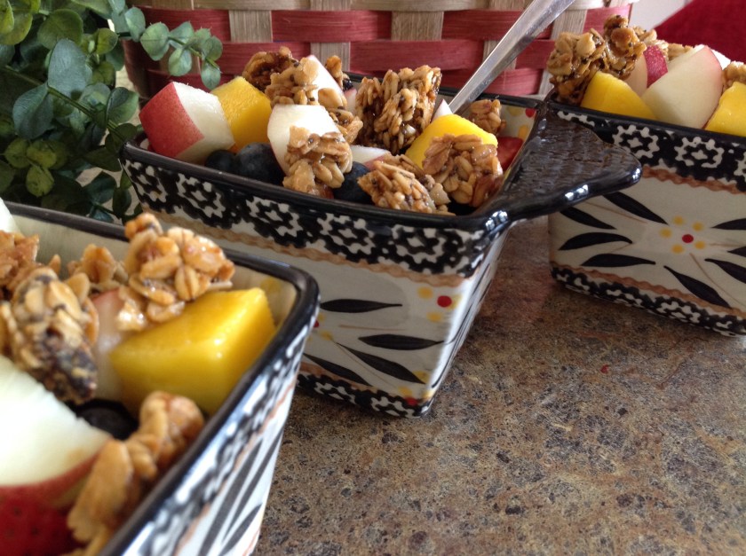 This morning I made a batch of granola clusters to accompany many of the fruits that I grew or purchased from a local farm. A dollop or two of plain yogurt finishes off the dish. (The peaches aren’t quite in season yet so I suppose, there are a few things in the dish that I am hopelessly awaiting as the season continues to bring us an abundance of delicious and nutritious delicacies.)
