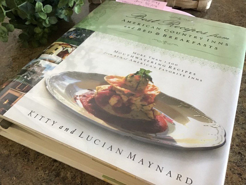 This week, I scheduled a community meeting that was to take place at a local library. After rechecking my calendar invite, I realized that I had arrived a bit early, so I took this opportunity to stroll through a selection of cookbooks that had been carefully selected for a main aisle display. My eyes immediately fixed on an older book showcasing recipes from quaint country inns and bed & breakfast establishments. Thumbing through the pages, so many of the recipes seems quick, easy, and scrumptious. Knowing that my meeting would be starting soon, I grabbed my library card and borrowed the book entitled Best Recipes from American Country Inns and Bed & Breakfasts by Kitty and Lucian Maynard.