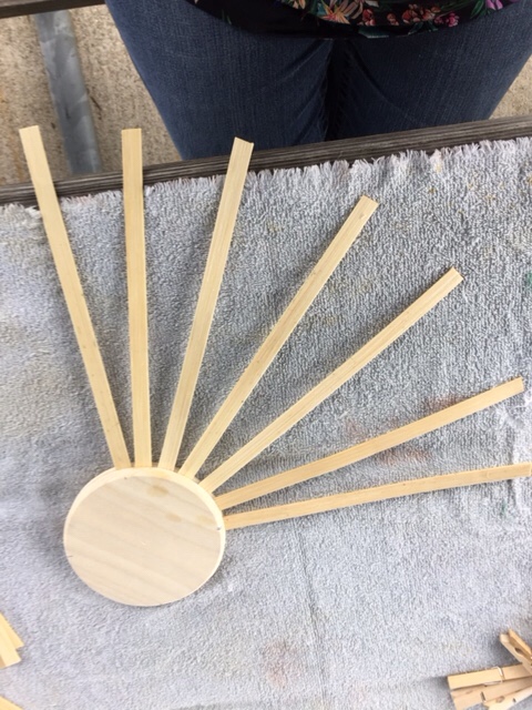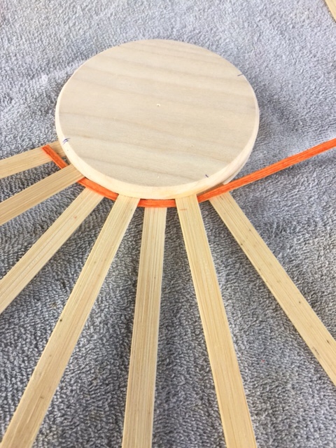 Dividing the disk into 4 equal parts, place 23 spokes within the well of the disk; weaving while working in the spokes.