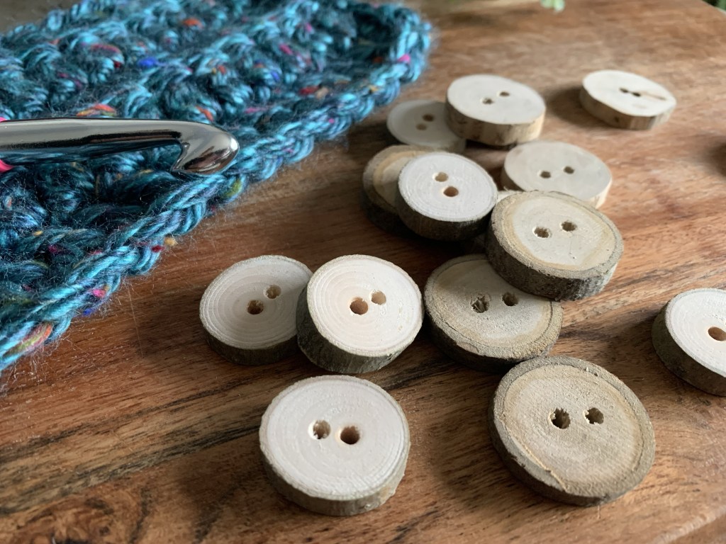 I enjoy making handmade gifts so I’ve been crocheting items for the holiday season. Recently, I visited a local craft store to find buttons that would adorn some of my crocheted cowls and book covers. I was thoroughly disappointed with the selection and voiced my concern to my hubby. He quickly gathered up some fallen branches from our forested property and made me these fabulous buttons. He used a vice to hold the branch (circumference about 1”) and a hand saw to carefully cut the 1/4” buttons. Then he drilled holes using a 1/8 bradpoint drill bit to secure the buttons with yarn. (He often uses a radial arm saw to quickly made several buttons.). He then sanded the face and edges of each button. I will lightly finish these with mineral oil and our beeswax. I am in love with this rustic look! Can’t wait to attach them to my latest creations…