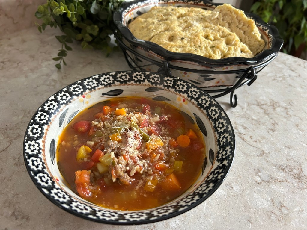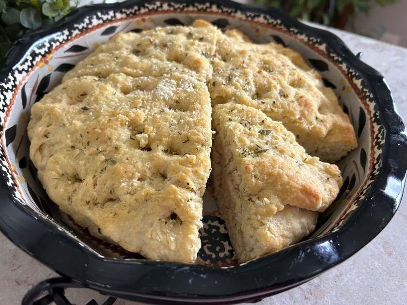 When I don’t have time to make a traditional focaccia, this Italian herbed biscuit wedge is my “go-to” recipe. A quick dough is carefully pressed into a 9” baking dish and baked until golden. Served warm with tomato-based soups or pasta, it’s simply delicious!