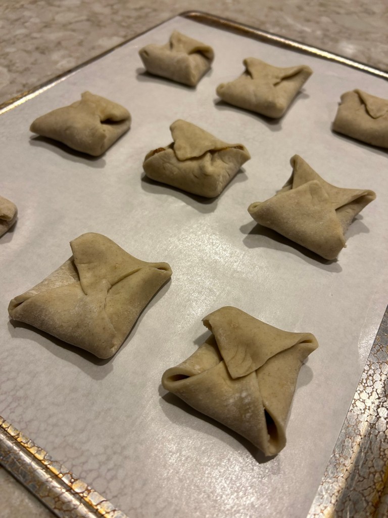 - Continue the process with the remaining dough and filling, placing the shaped kolaches on the parchment-lined baking sheets. For extra security, you can brush the corners with a little water.