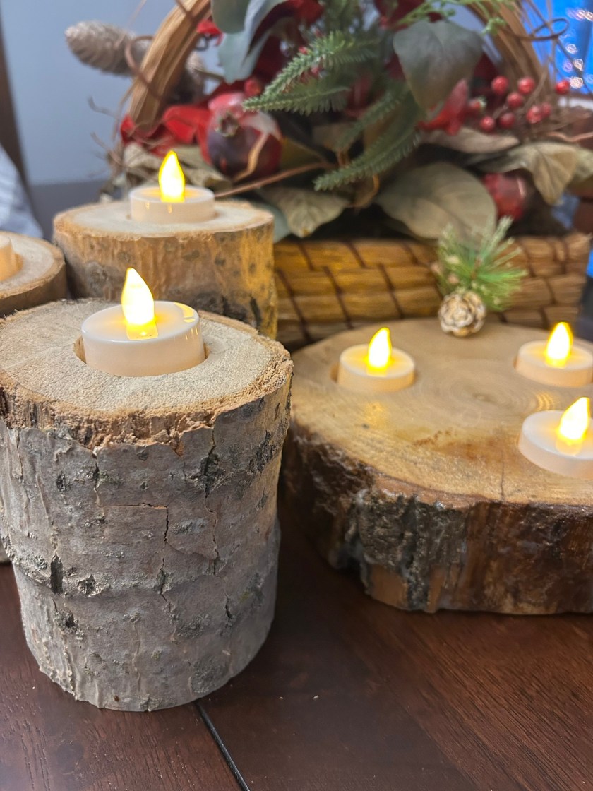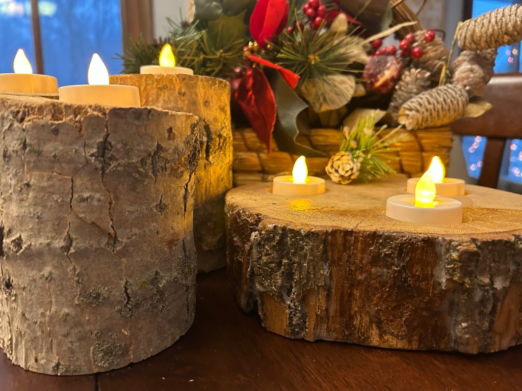 One of my favorite holiday ideas is creating a rustic Christmas tablescape with flameless candles nestled in wooden stumps. While real tea lights may look charming, they pose a fire risk in dry wood—so flameless candles are the safer choice.