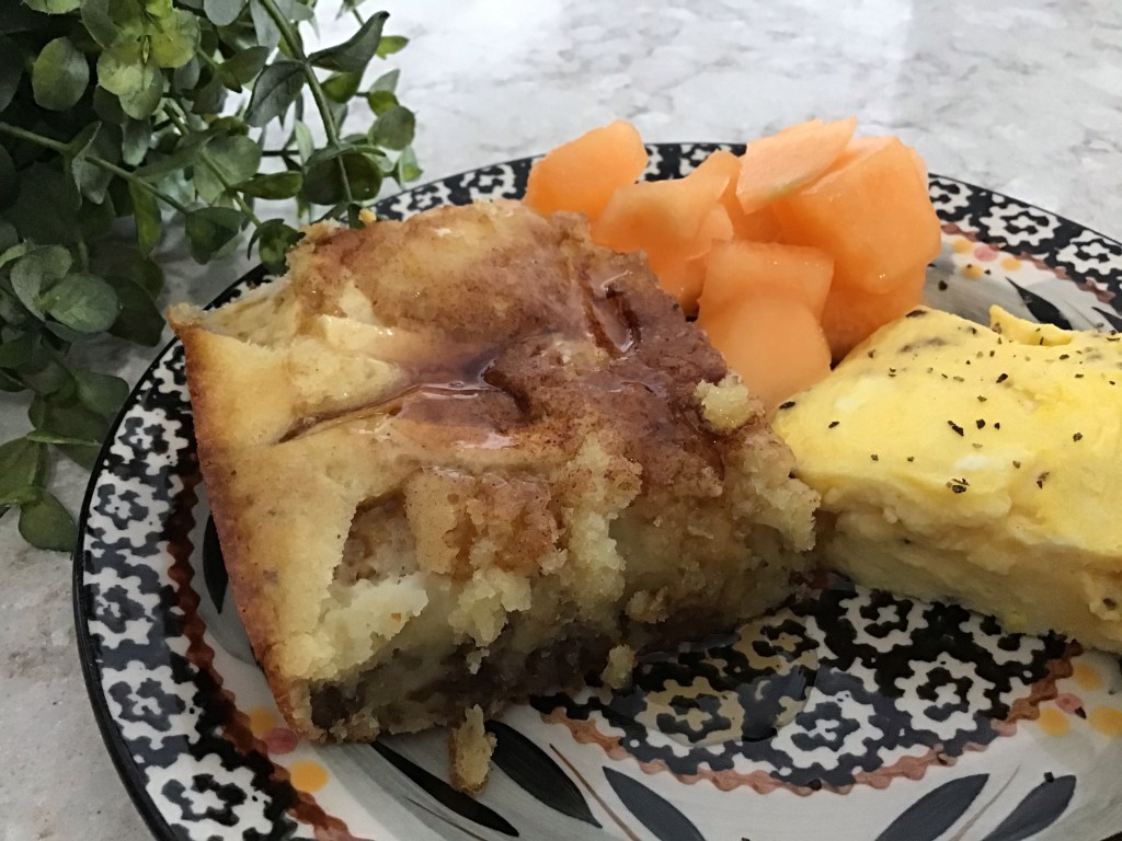 Everything is basically dumped into a bowl, mixed together and tossed in a greased baking pan. Then, the mini chocolate chips are sprinkled over the top… easy enough! This is a super simple recipe with extraordinary results.