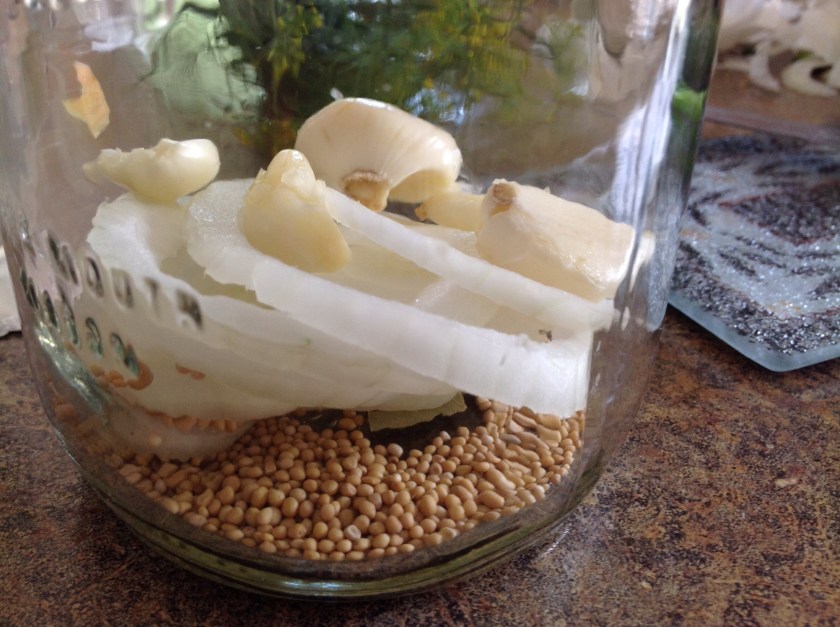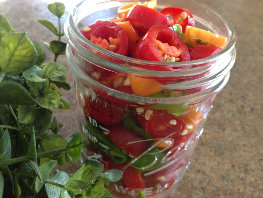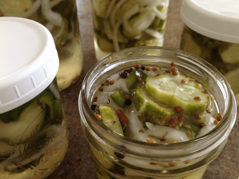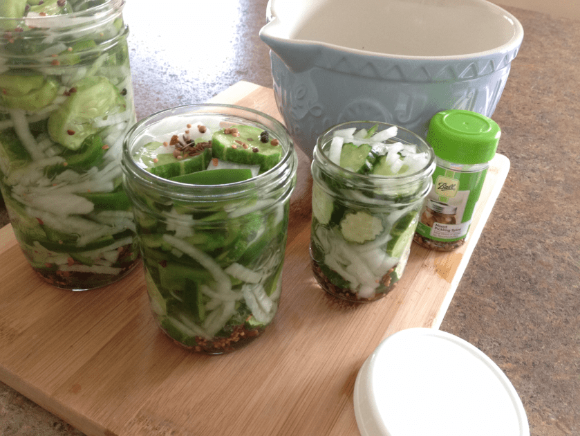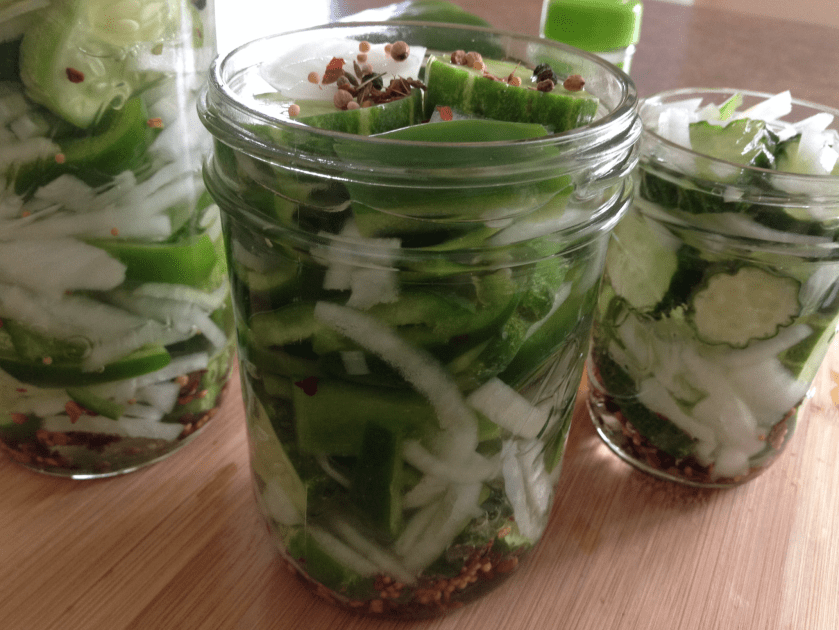 I was pleasantly surprised this week when a co-worker brought in a big bag of freshly picked pickling cucumbers and plopped them on the break room table. She announced that the cucumbers were from her father’s garden and that anyone was welcome to take as many as they liked. Straight away, I scooped up a good majority of the pickles and packed them away for one of my favorite summer projects. When I returned home from work that evening, I began the task at hand, slicing the veggies for my refreshing refrigerator pickles.