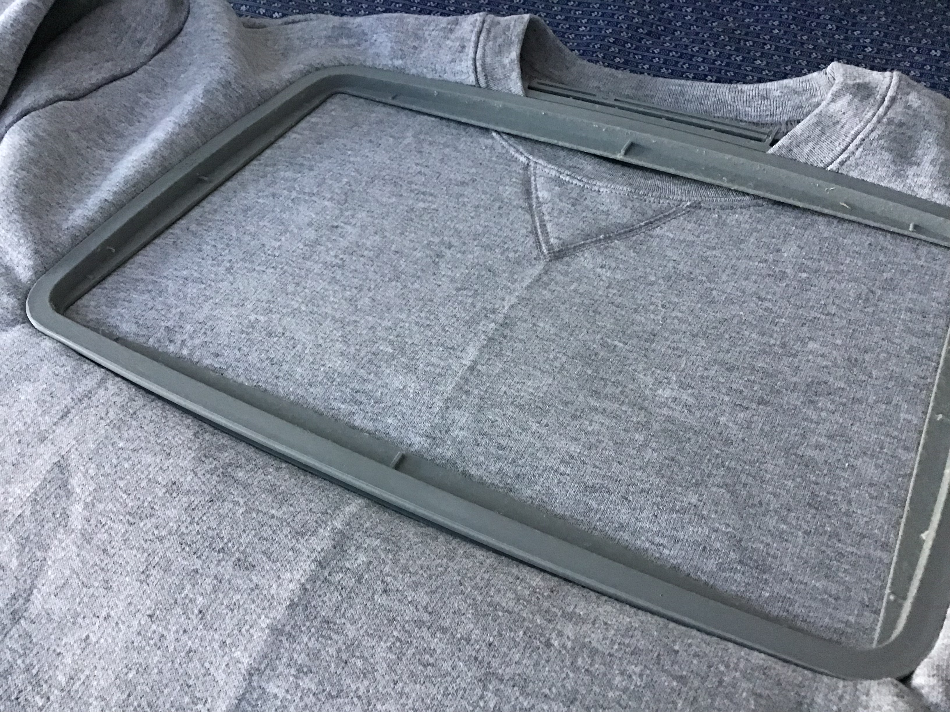 Crease the sweatshirt to find it’s center and position the embroidery hoop paying close attention to desired design placement.
