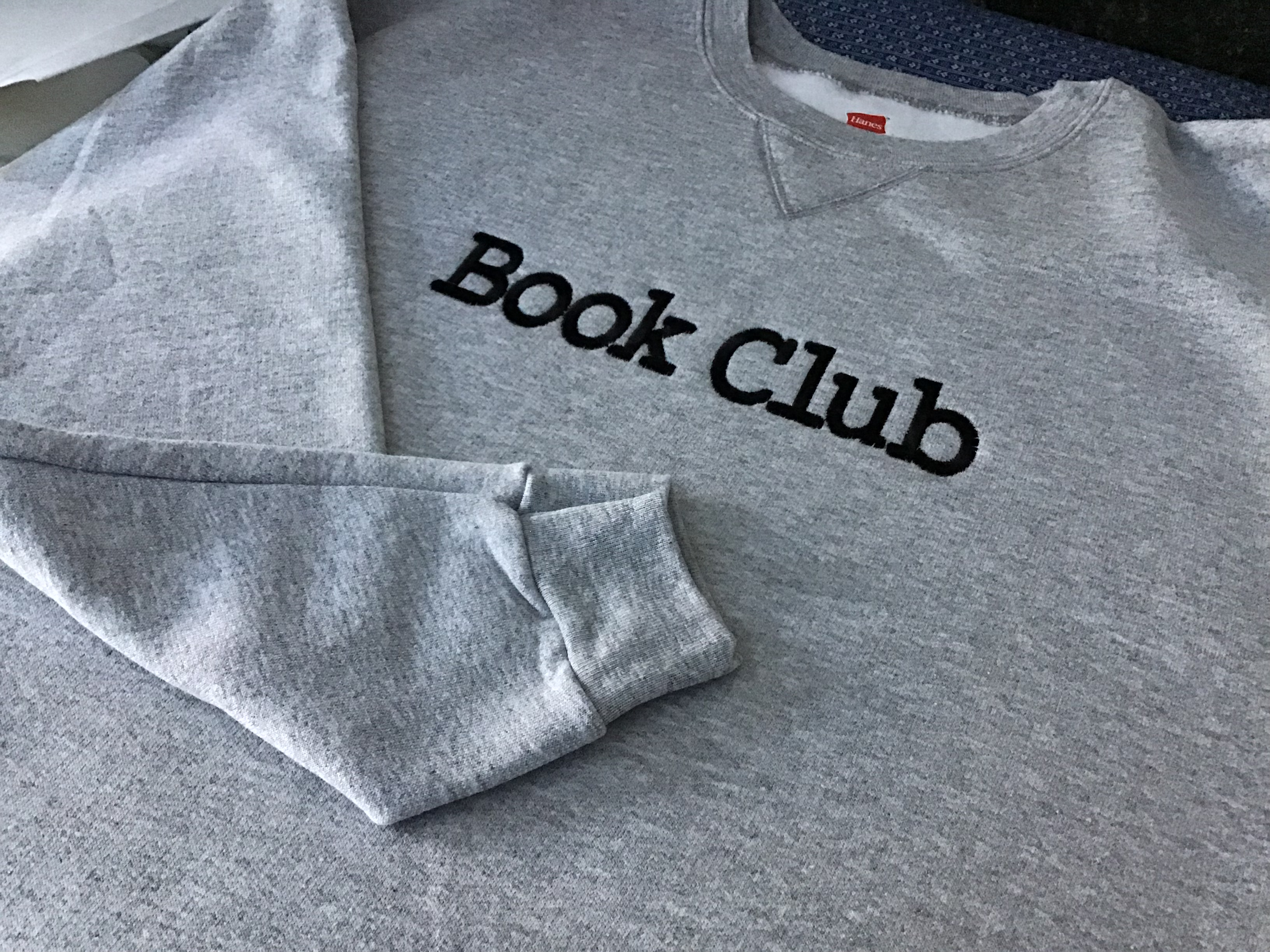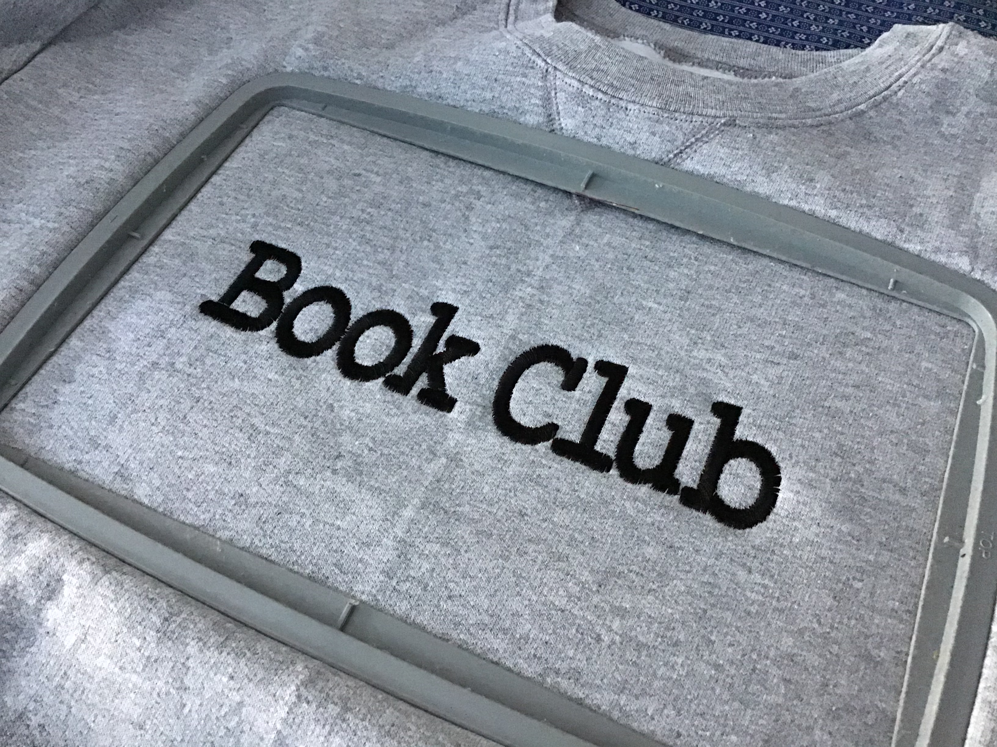 My daughter had seen one of the famous Fixer Upper hosts wearing a sweatshirt with the words, “Book Club” screen printed onto the front of the garment. Being an avid reader, she immediately declared her desire to have a shirt like this for Christmas. After looking up the cost for said sweatshirt, I decided to make one of my own using my trusty embroidery machine. Carefully reviewing the garment, I quickly found a few heather colored sweatshirts at the discount store and identified a font that would work the the “Book Club” design. I didn’t care for the font used in the original design so I settled on a text style that looked just like one found when reading a book; a contemporary spin on Times New Roman. Here are the steps I used to embroider font or text onto the front of a basic medium-weight sweatshirt.