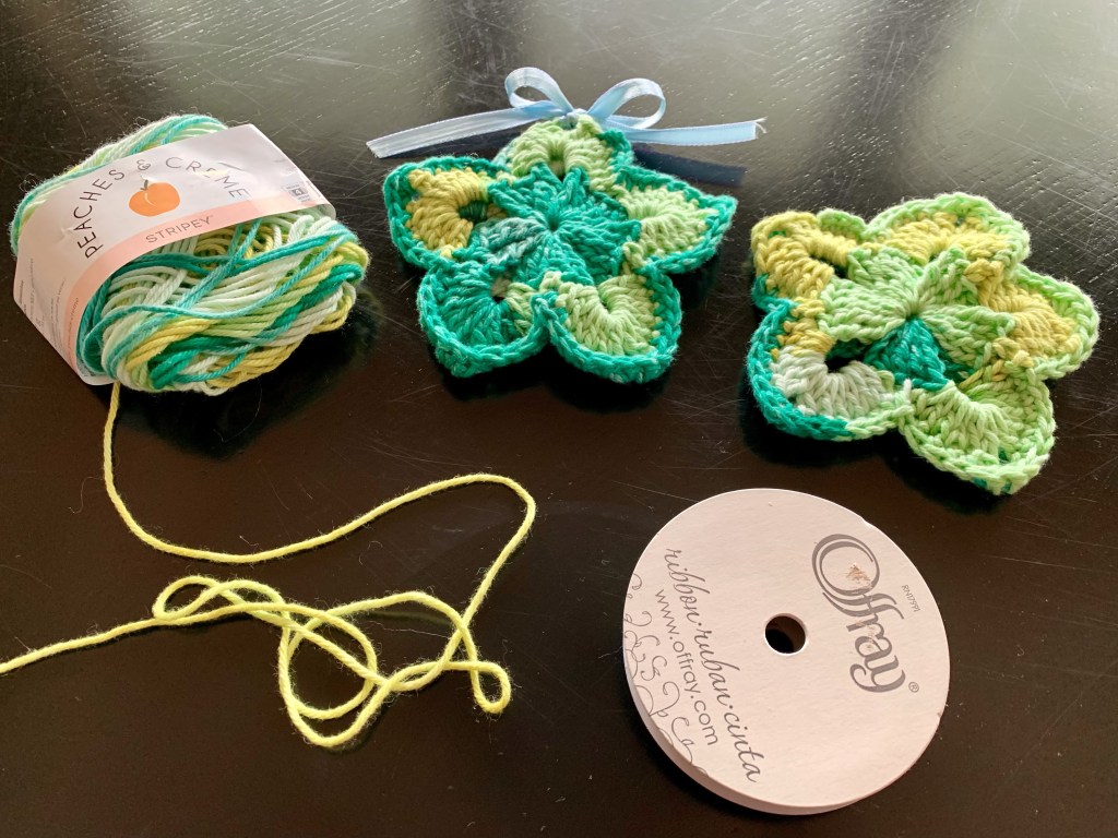 I also found a YouTube video for compact Easter Crochet Flower that hold Cadbury Eggs for a cute co-worker gift before the holiday. I used Peaches and Creme yarn from Walmart ($1.99 at Florida Walmart) to complete the flowers. These cakes are compact and easy to pack. I also travel with a mesh craft bag that fits in my carry on. Inside I have crochet hooks, stitch markers, TSA approved scissors, tapestry needles, etc.