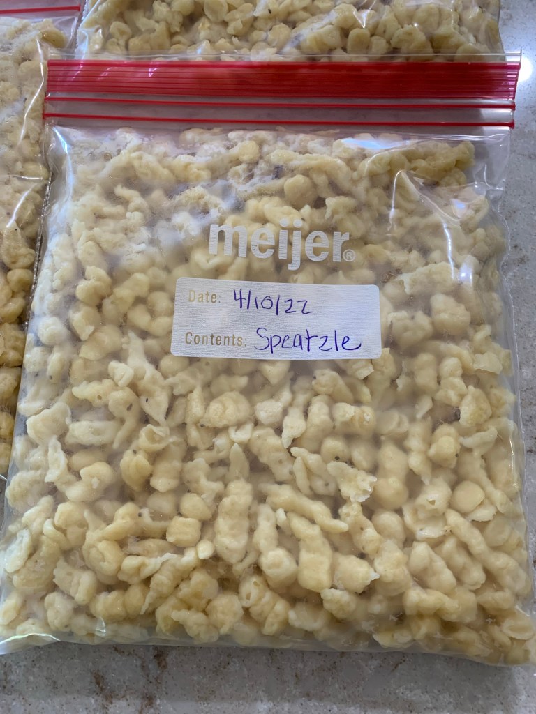 - Serve the spaetzle immediately or saute them in butter to crisp. If you don’t serve or saute them right away, add 1 or 2 Tbsp of butter to the hot spaetzle to prevent them from sticking together.If desired, freeze in quart-sized freezer bags for later use.