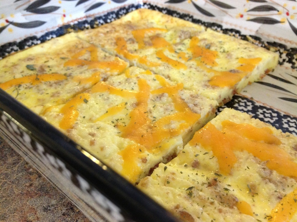 Preheat oven to 350 degrees. Spray a 13×9″ baking pan with non-stick cooking spray. In a medium bowl, whisk together eggs with milk or half&half. Stir in shredded cheese, and bacon pieces. Pour into baking pan and bake for 17-20 minutes or until set, puffy, and lightly browned. Cool slightly before cutting into squares.