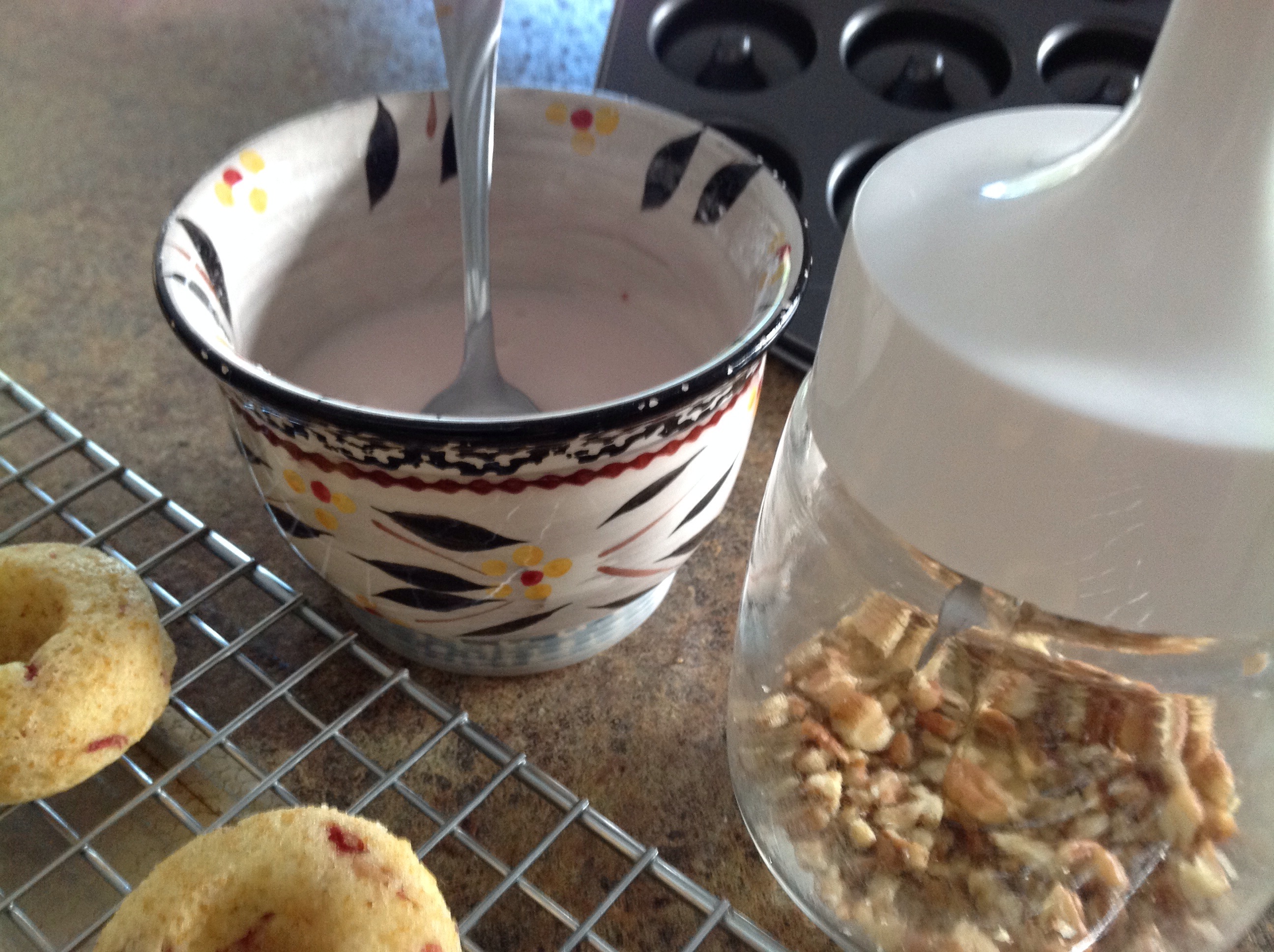 Preheat oven to 350 degrees. Lightly spray with cooking spray, the donut baking pans. For the donuts: In a medium bowl, carefully stir together the muffin mix, cranberries, orange juice and extract. Combine just until blended. Place the batter in a gallon-sized sealable bag (or a pastry bag). Snip the plastic bag 1/8″ from the corner. Evenly pipe the batter into the mini-donut baking pans. Bake 8-12 minutes or until donuts spring back when touched. Cool and remove to wire rack.