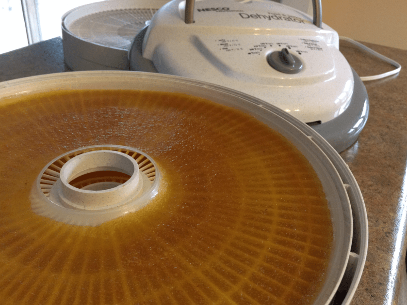Cool slightly. Spread mixture evenly on dehydrator fruit leather drying trays.