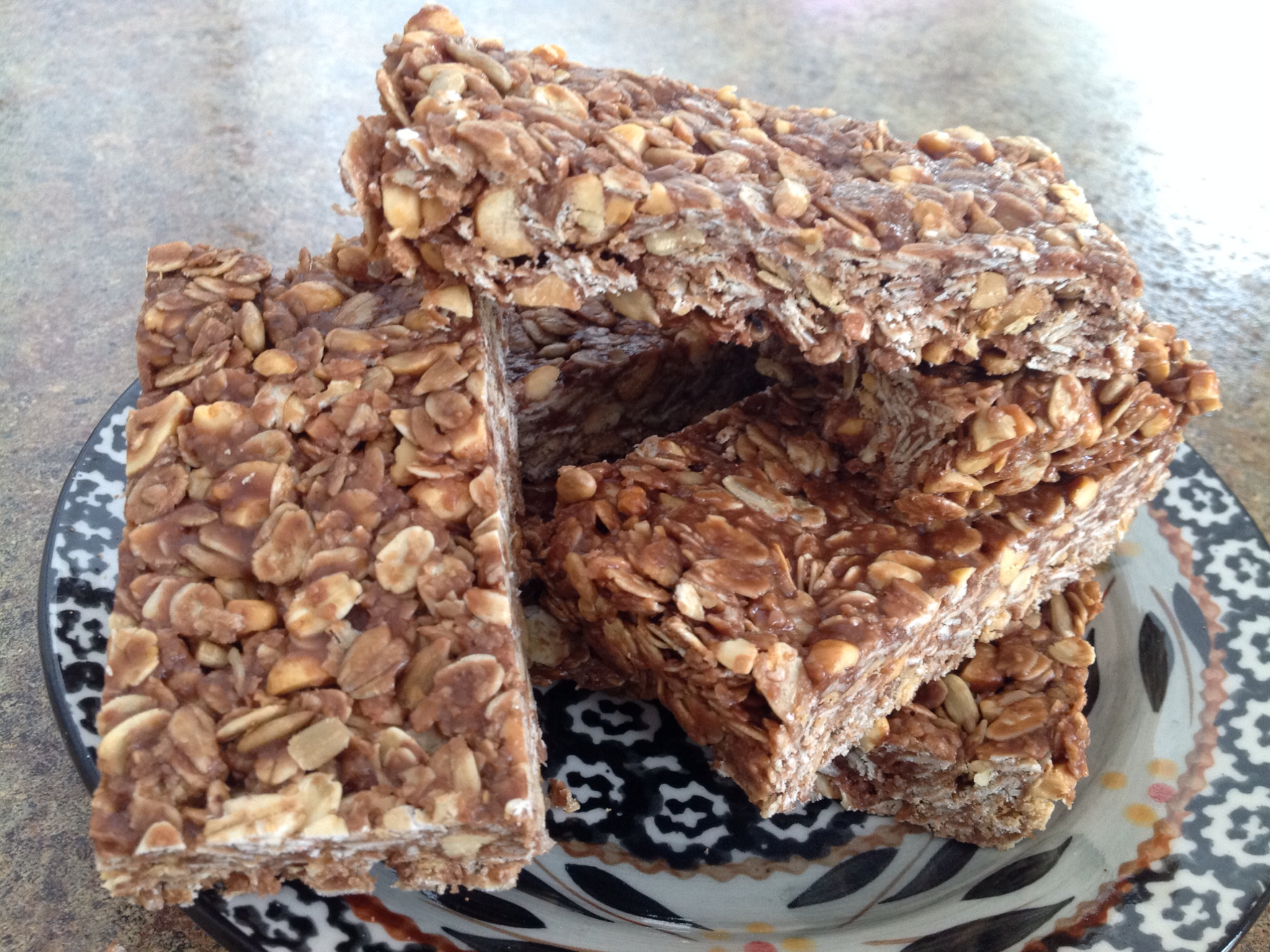 Add the warm honey mixture to the dry, toasted ingredients and toss to coat. Press into a greased 13×9″ pan. Cool. Cut into bars. Wrap individually with plastic wrap. Store in an air-tight container.
