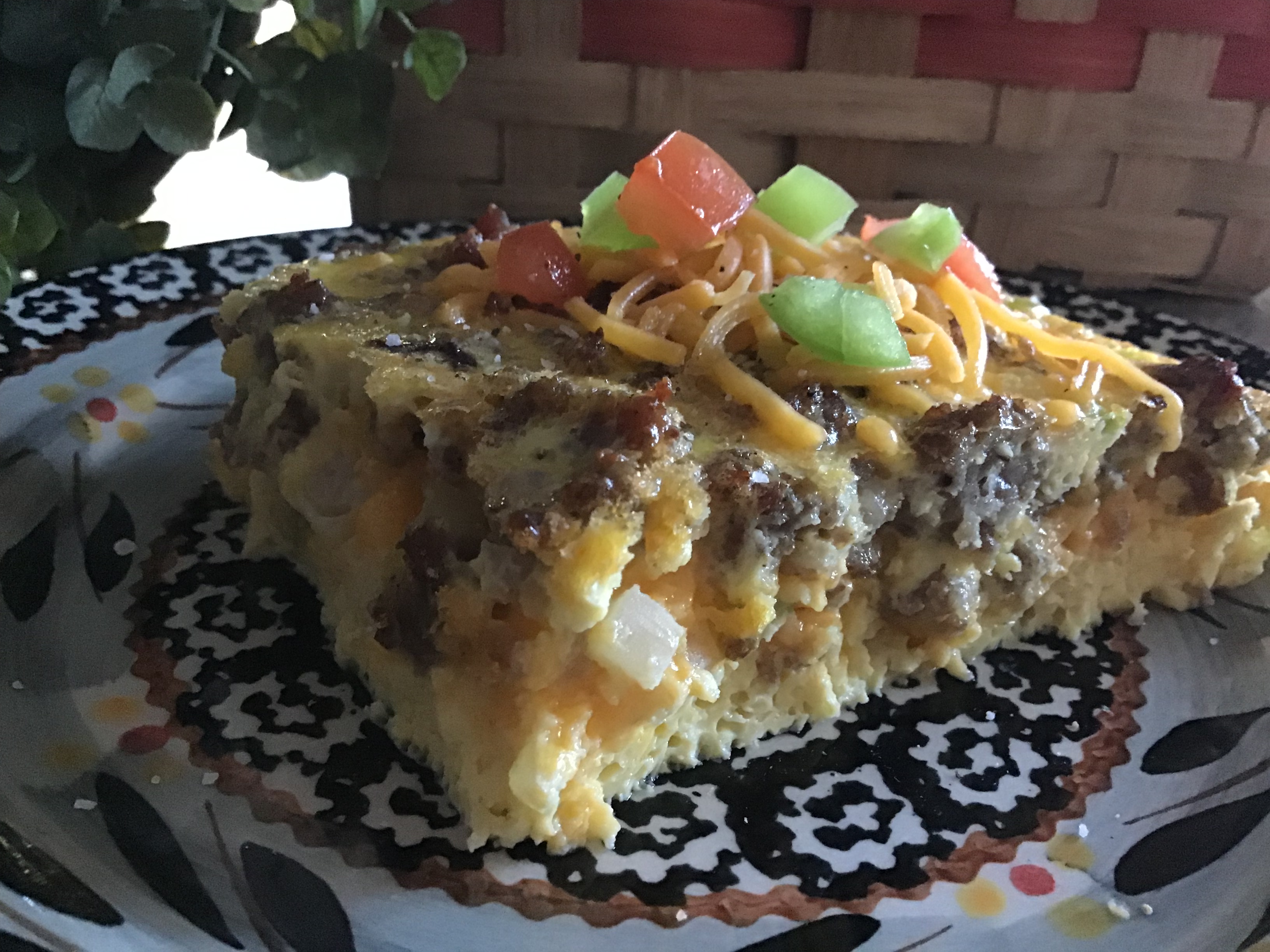 Pour the egg mixture into prepared pan. Sprinkle cooked sausage evenly over egg mixture distributing all ingredients. Bake for approximately 30-35 minutes or until center is set. Cool slightly and cut into serving sized squares.