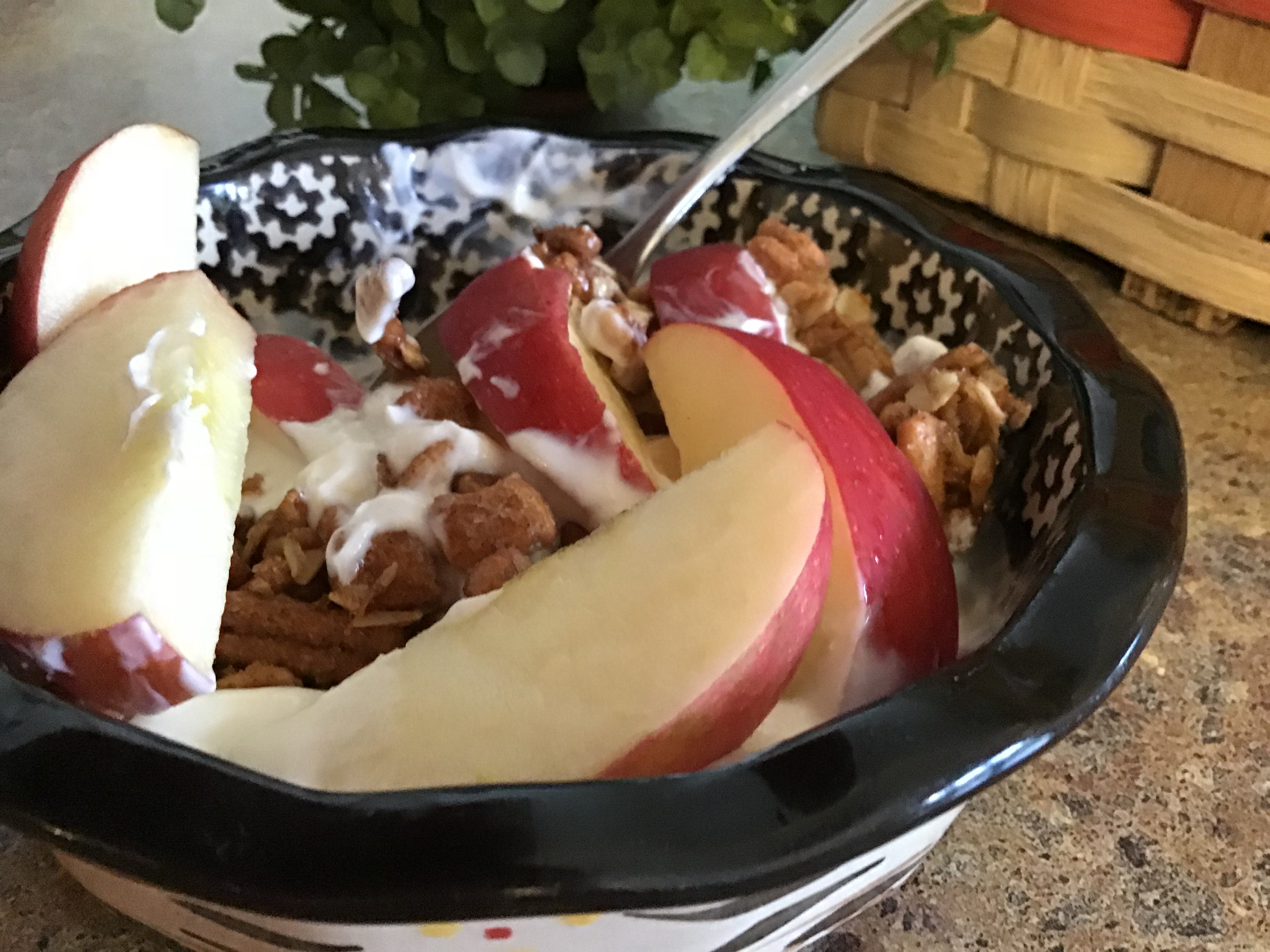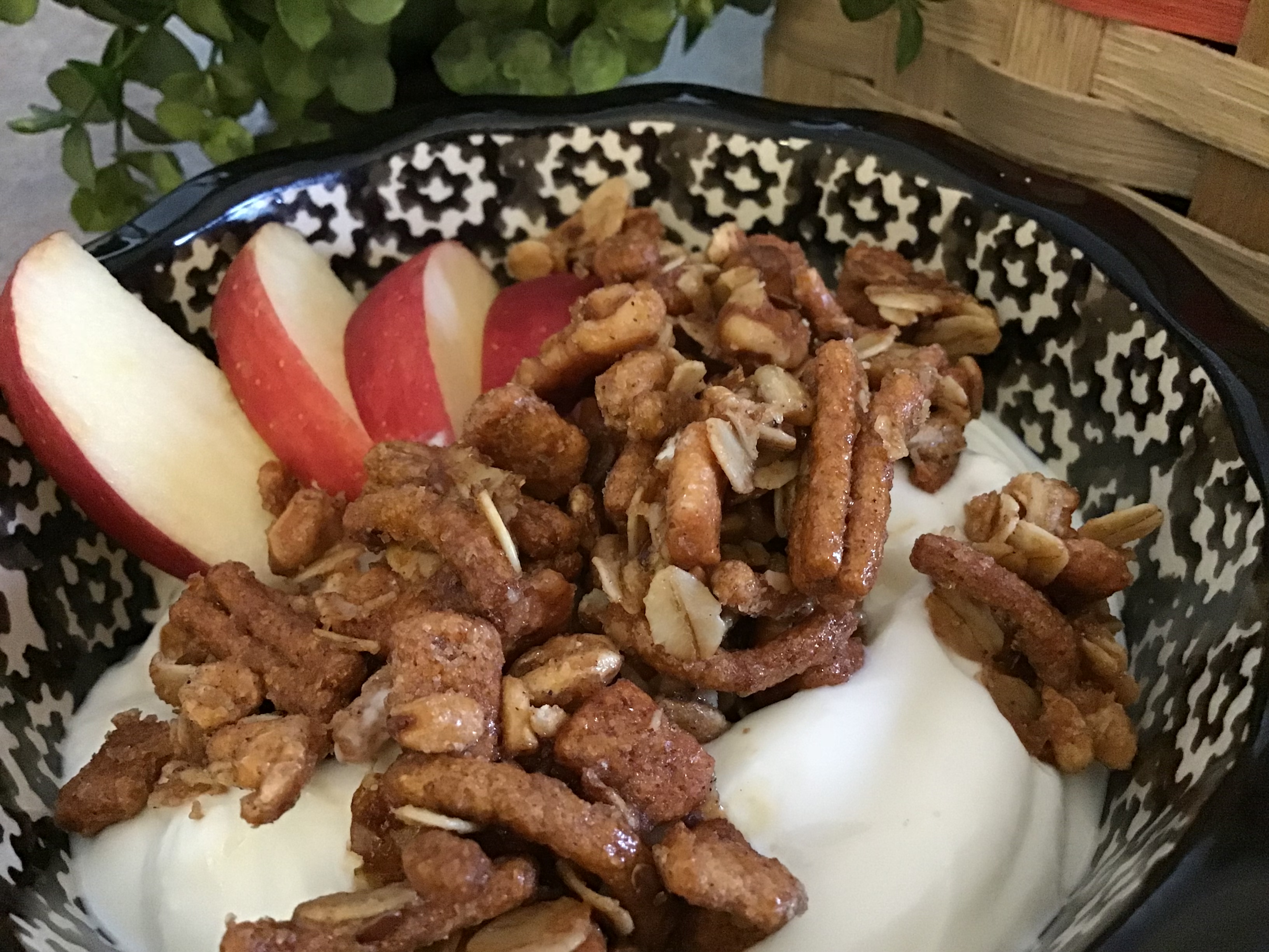 I also use our own maple syrup to sweeten the mix and it’s sticky properties help to form the crunchy granola clusters. Pair this delicious granola with Greek yogurt and sweet crunchy apples for an awesome breakfast combination. What a way to start the day!